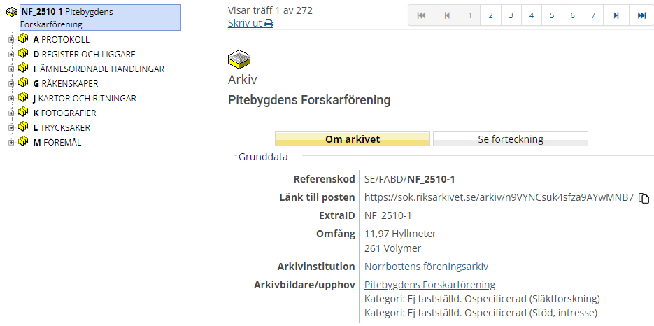 Där kan man söka på en massa olika sätt, förvarande institution, typ av källa eller t.ex ”Pitebygdens Forskarförening” och då får man fram en lista på allt material som vi har hos Norrbottens Föreningsarkiv i Luleå.